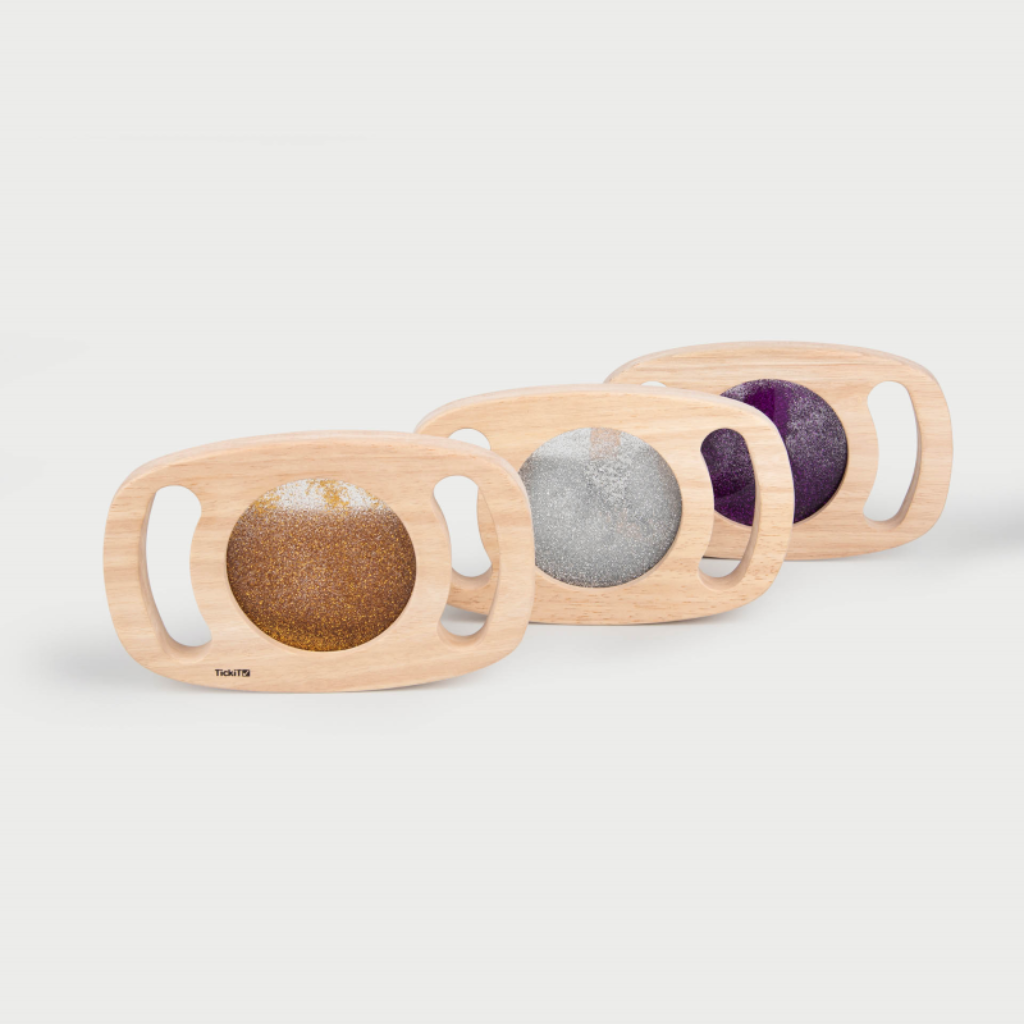 Deze set bestaat uit drie glitterpanelen met een stevig frame van massief rubberhout en makkelijk vast te houden handgrepen. Elk paneel bevat een sprankelende glittervloeistof in een eigen kleur: paars, zilver en goud.