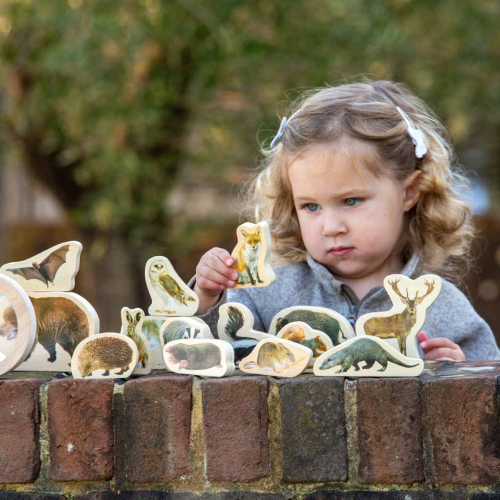 Deze houten blokken van Tickit tonen realistische afbeeldingen van bosdieren van over de hele wereld. De blokken zijn gemaakt van lichtgewicht berkenmultiplex en aan beide zijden bedrukt, waardoor ze uitnodigen tot kijken, vertellen en fantasierijk spel. De blokken zijn stevig, glad afgewerkt en makkelijk vast te houden voor kleine handen. Ze kunnen rechtop staan en gestapeld worden, wat ze geschikt maakt voor bouwen, sorteren en het creëren van speelscènes. Met deze set leren jonge kinderen spelenderwijs dieren herkennen en benoemen. Oudere kinderen kunnen de blokken gebruiken om verhalen te bedenken, hun taalvaardigheid te ontwikkelen en gesprekken te voeren over natuur, leefgebieden en zorg voor het milieu.