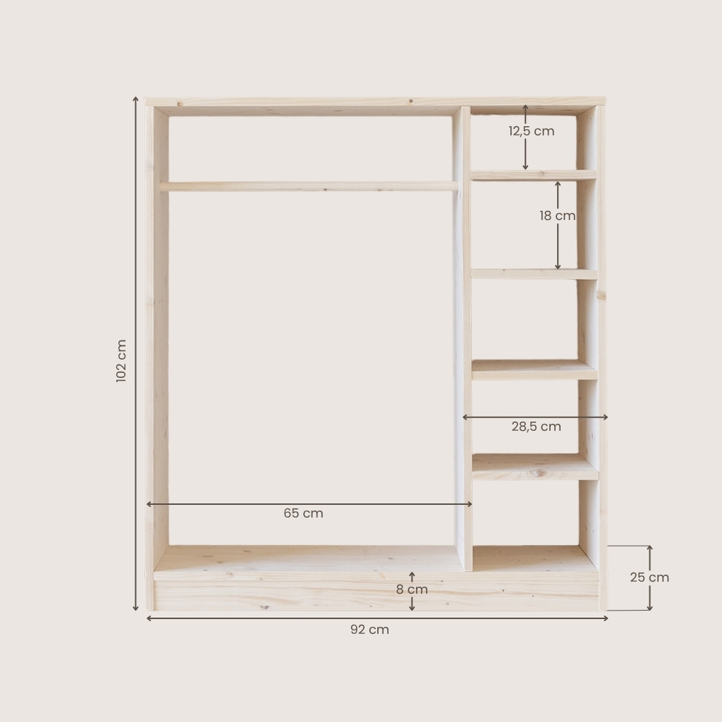 Deze super leuke montessori kledingkast heeft een open karakter en is ideaal om te gebruiken voor kleuters die zelfstandig zijn of haar outfit uit willen kiezen. Het kiezen van eigen kleding stimuleert kinderen om zich zelfstandig aan te kleden. De kledingkast past erg goed bij het houten montessoribed. Op deze manier creëer je een mooi geheel op de kinderkamer.