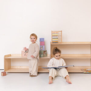 Voor de wat kleinere kinderen hebben we ook een lagere uitvoering van de montessori speelgoedkast met twee schappen. Zo kun je er voor zorgen dat ook kinderen die net kunnen lopen of staan zelf speelgoed kunnen