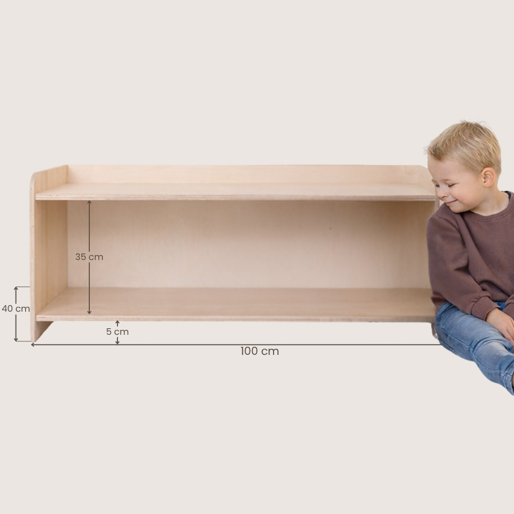 Uiteraard is niet alleen de montessori speelgoedkast belangrijk, maar zeker ook wat er in of op komt te staan. Daarmee kun je fijn afwisselen terwijl je dit afstemt op de leeftijd van de kinderen. Bij deze lage uitvoering met twee planken is de hoogte van het hoogste schap 35 centimeter. Daar kunnen dus doorgaans alle kinderen die kunnen staan bij.