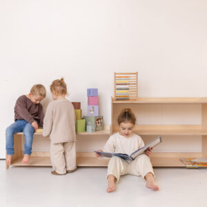 Uiteraard is niet alleen de montessori speelgoedkast belangrijk, maar zeker ook wat er in of op komt te staan. Daarmee kun je fijn afwisselen terwijl je dit afstemt op de leeftijd van de kinderen. Bij deze lage uitvoering met twee planken is de hoogte van het hoogste schap 35 centimeter. Daar kunnen dus doorgaans alle kinderen die kunnen staan bij.