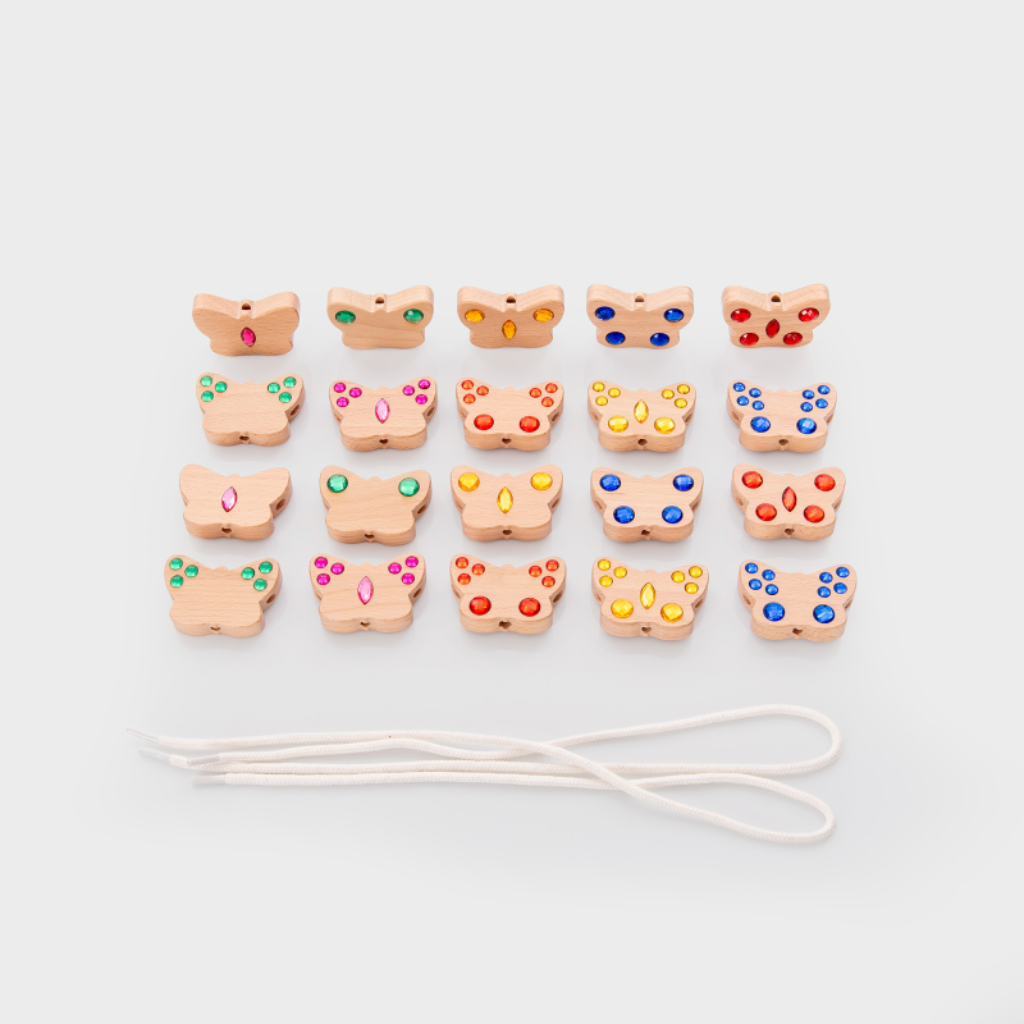 Rijgen is een waardevolle voorbereiding op het leren schrijven: het versterkt de hand-oogcoördinatie en de fijne motoriek. Daarnaast lenen de vlinders zich goed voor tellen, sorteren, fantasierijk spel en het stimuleren van taal door verhalen en beschrijvingen te bedenken.