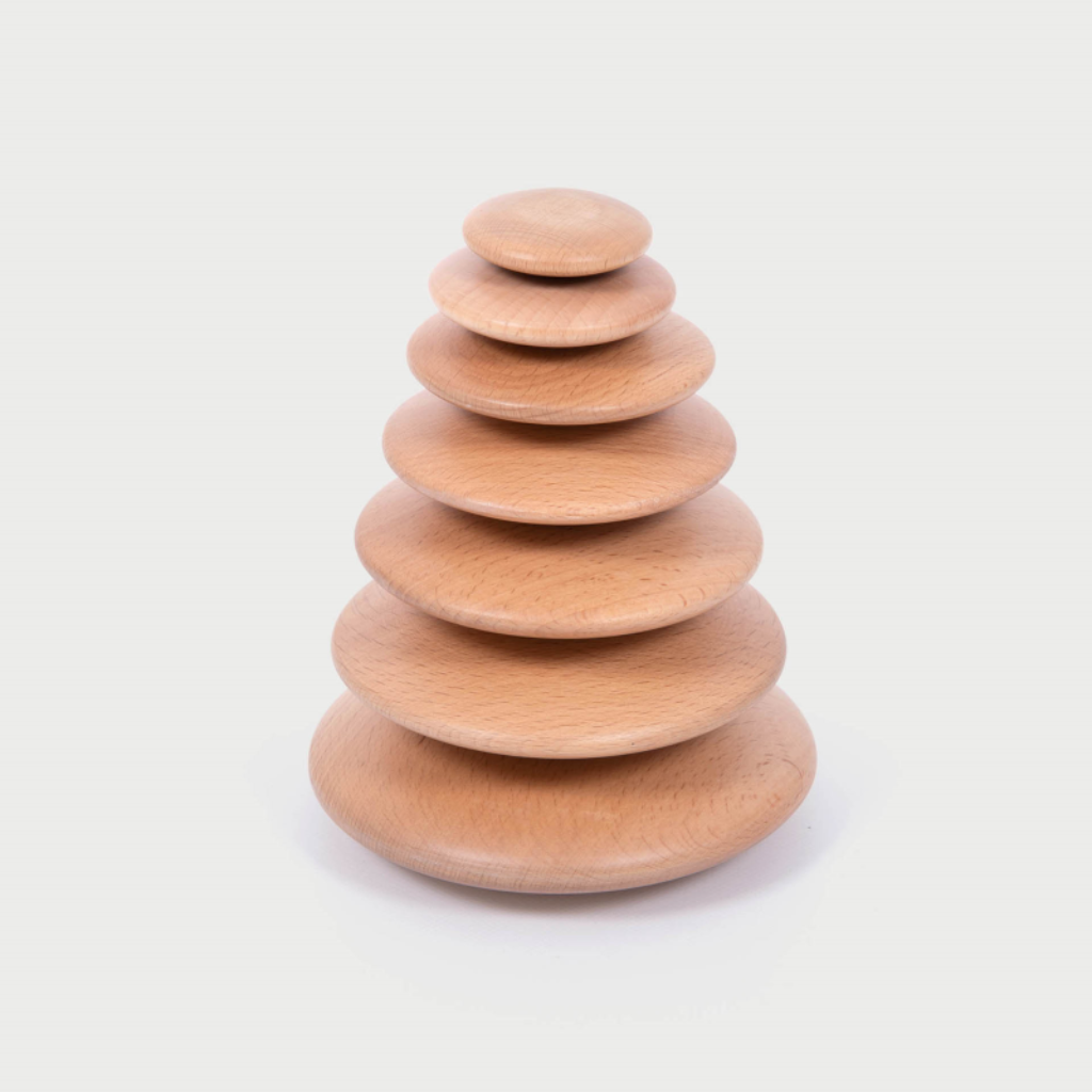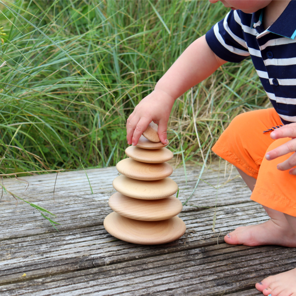 Deze houten schijven van Tickit zijn gemaakt van glad beukenhout en hebben een natuurlijke afwerking waarbij de houtnerf zichtbaar blijft. De rustige uitstraling maakt dit spelmateriaal geschikt voor open-einde spel zonder afleiding. De schijven zijn uitgevoerd in oplopende formaten en hebben licht afgeplatte oppervlakken. Hierdoor kunnen kinderen ze stapelen, balanceren en combineren, wat uitnodigt tot experimenteren en ontdekken. Dit open-einde spelmateriaal is al geschikt voor jonge kinderen en ondersteunt de ontwikkeling van hand-oogcoördinatie en logisch denken.