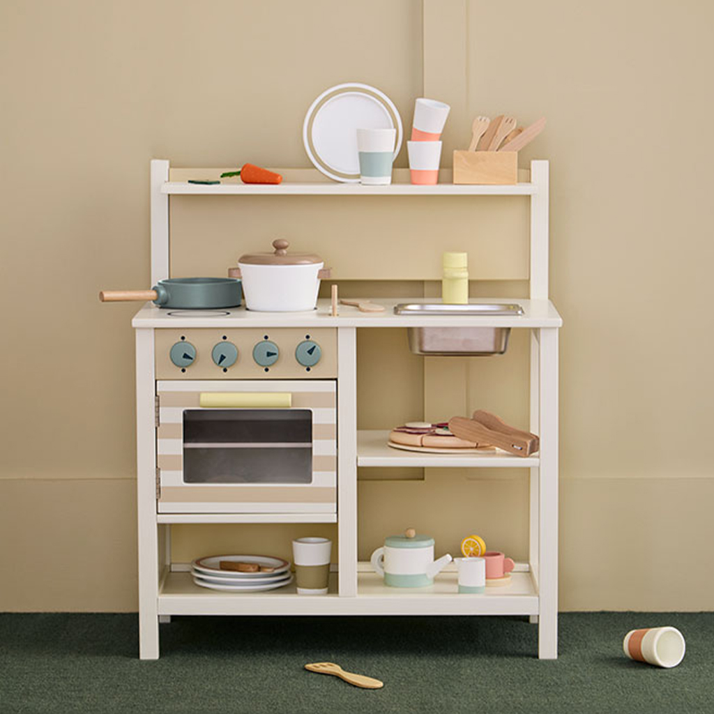 In de kinderkeuken van Kid’s Concepts vind je verschillende slimme planken waar perfect ander keukenspeelgoed kan staan bijv. deze boodschappenset. Door het ontwerp en het materiaal is de speelgoedkeuken erg stabiel. Het is op deze manier net een echte keuken. Dus laat de kinderen hun schort aantrekken en bakken en kokkerellen maar!