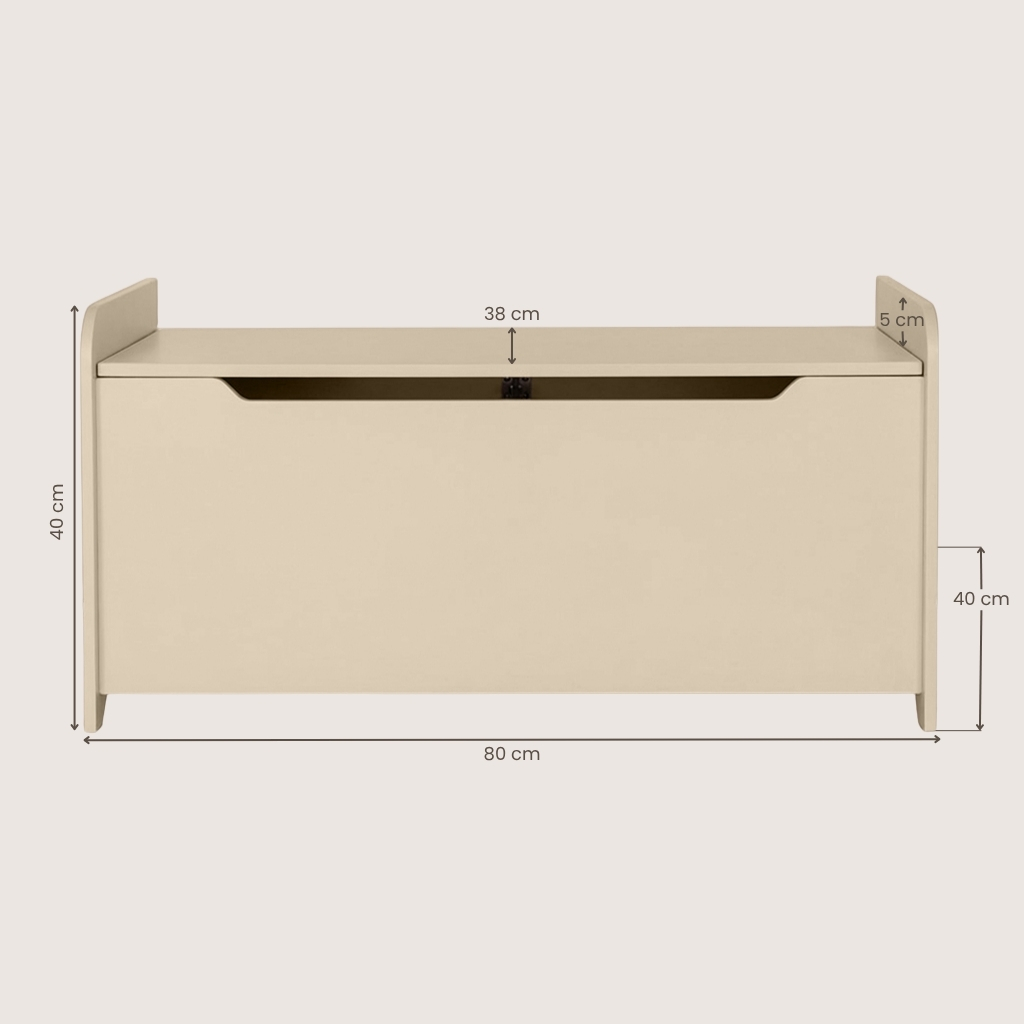 De speelgoedkist is voorzien van een handige inkeping aan de voorzijde. Dit ziet er niet alleen mooi uit, maar is ook extra veilig. Zo kunnen kleine handjes niet snel tussen de deksel en de voorzijde komen. Bovendien is het openen van de deksel makkelijker en kan deze niet luchtdicht afgesloten worden door het design.