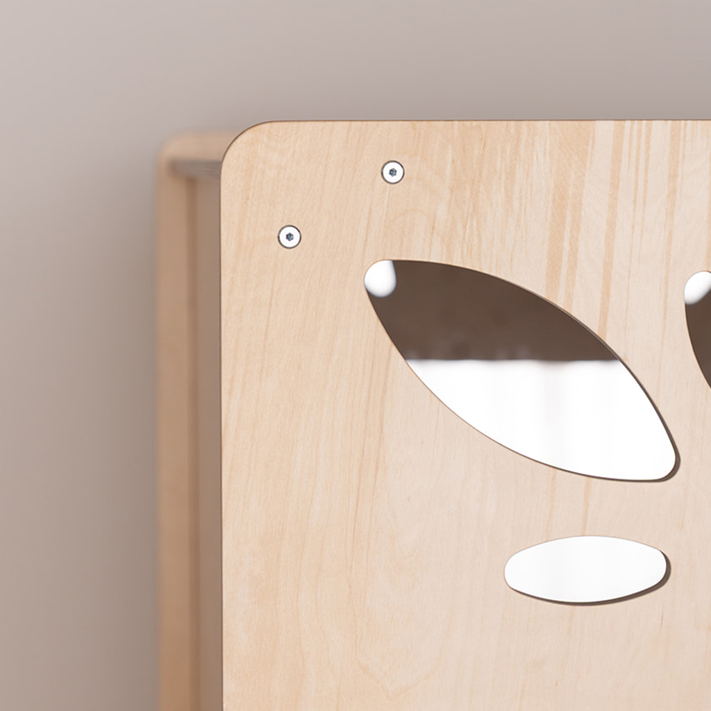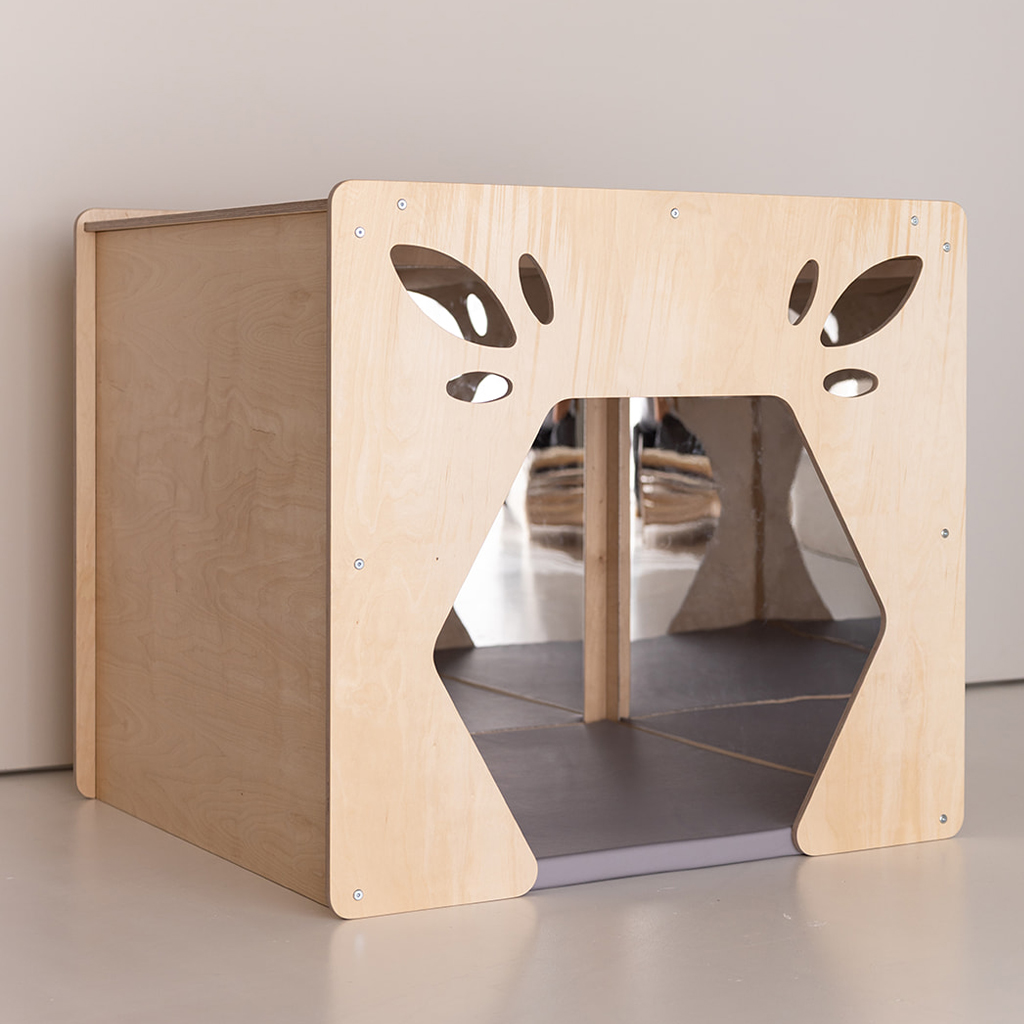 De drie spiegels van plexiglas zijn mooi verwerkt in de wanden van stevig berkenmultiplex. Aan de voorzijde zijn handige openingen gemaakt. Niet alleen omdat het er leuk uitziet, maar ook om voldoende licht binnen te laten komen. Dat geldt overigens ook voor de bovenzijde. Daar hebben we sleuven ingemaakt voor de lichtinval. Zo kunnen kinderen zichzelf altijd goed zien. En niet onbelangrijk: volwassenen die een oogje in het zeil houden ook!