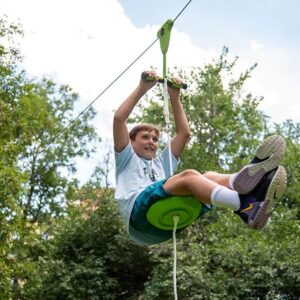 Deze kabelbaan | zipline met een lengte van 11 meter bevordert het actief buitenspelen. Met dit uitdagende speelgoed ontwikkelen kinderen spelenderwijs hun balans, evenwicht coördinatie en zelfvertrouwen. De kabelbaan is ontworpen met oog op veiligheid en duurzaamheid en er wordt gebruikt gemaakt van hoogwaardige materialen. Durf jij de uitdaging aan om van de ene naar de andere kant te ‘sliden’? De set perfect voor thuis in de tuin of om bijvoorbeeld mee te nemen naar het bos of park.