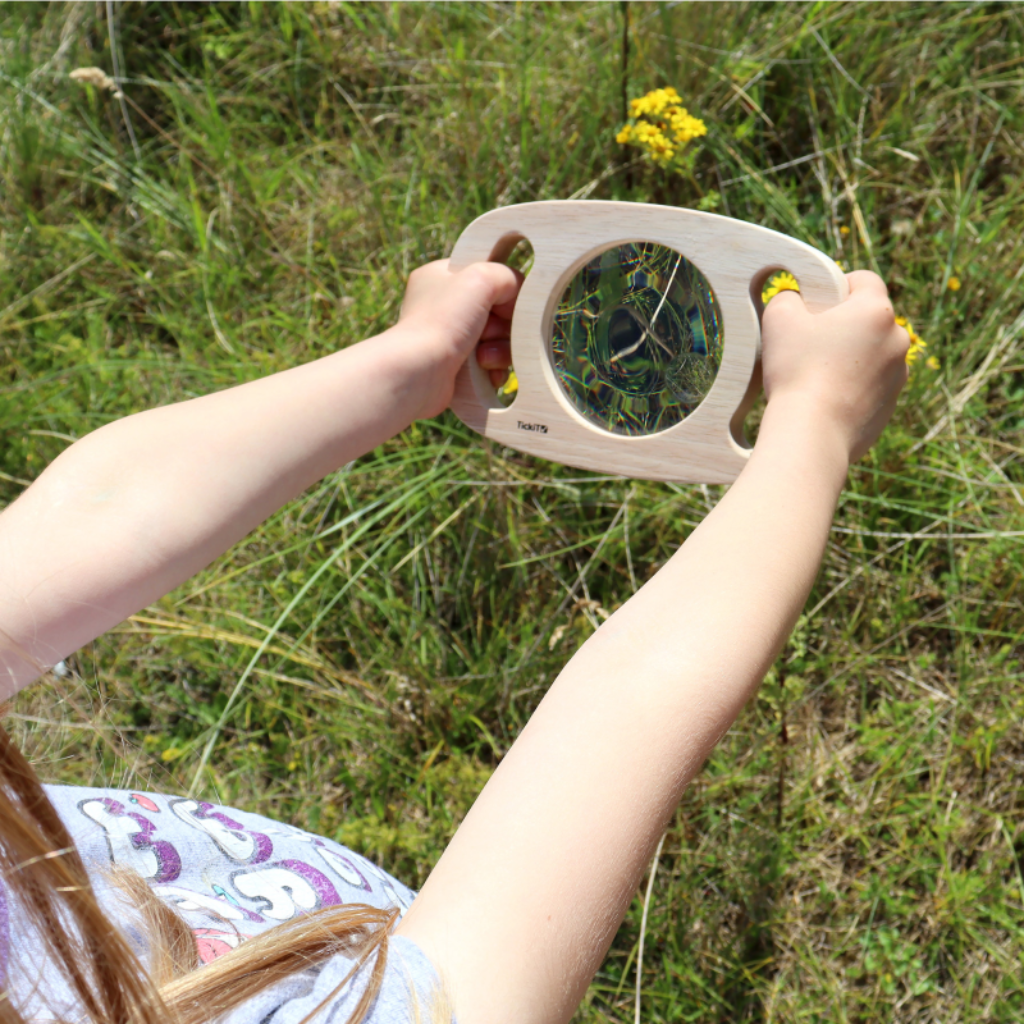 De Easy Hold ontdekkingsset is een set van 6 stevige frames waarmee kinderen de wereld op een nieuwe manier kunnen bekijken. De massief rubberhouten frames bevatten verschillende lenzen en spiegels die kleur, vorm en reflectie veranderen en zo nieuwsgierigheid en verwondering stimuleren.