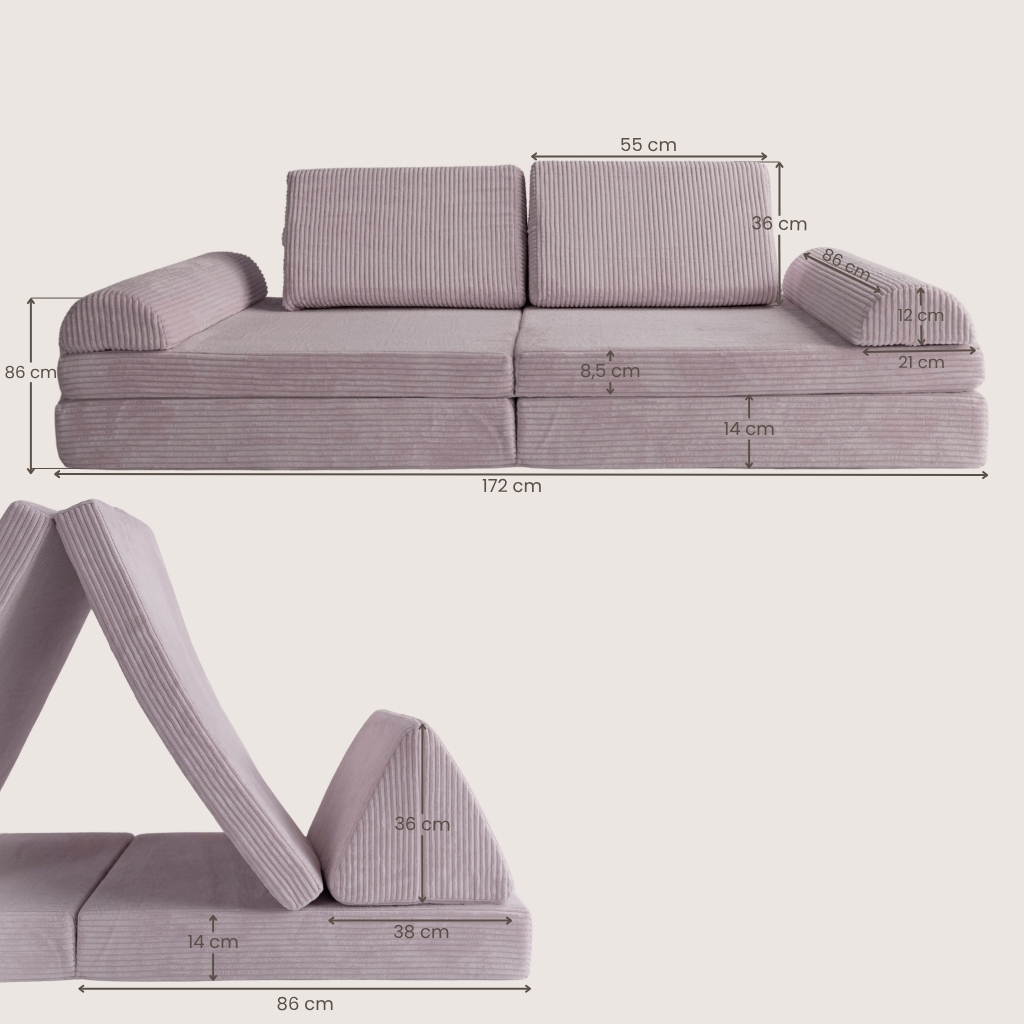 Speelbank voor kinderen bestaande uit 6 elementen. Afneembare hoezen van stijlvolle en zachte ribstof (corduroy) in de kleur oud roze. Deze modulaire speelbank van Jindl is leuk om mee te spelen én mooi om naar te kijken. Dat betekent gegarandeerd speelplezier voor kinderen van alle leeftijden én volwassenen.