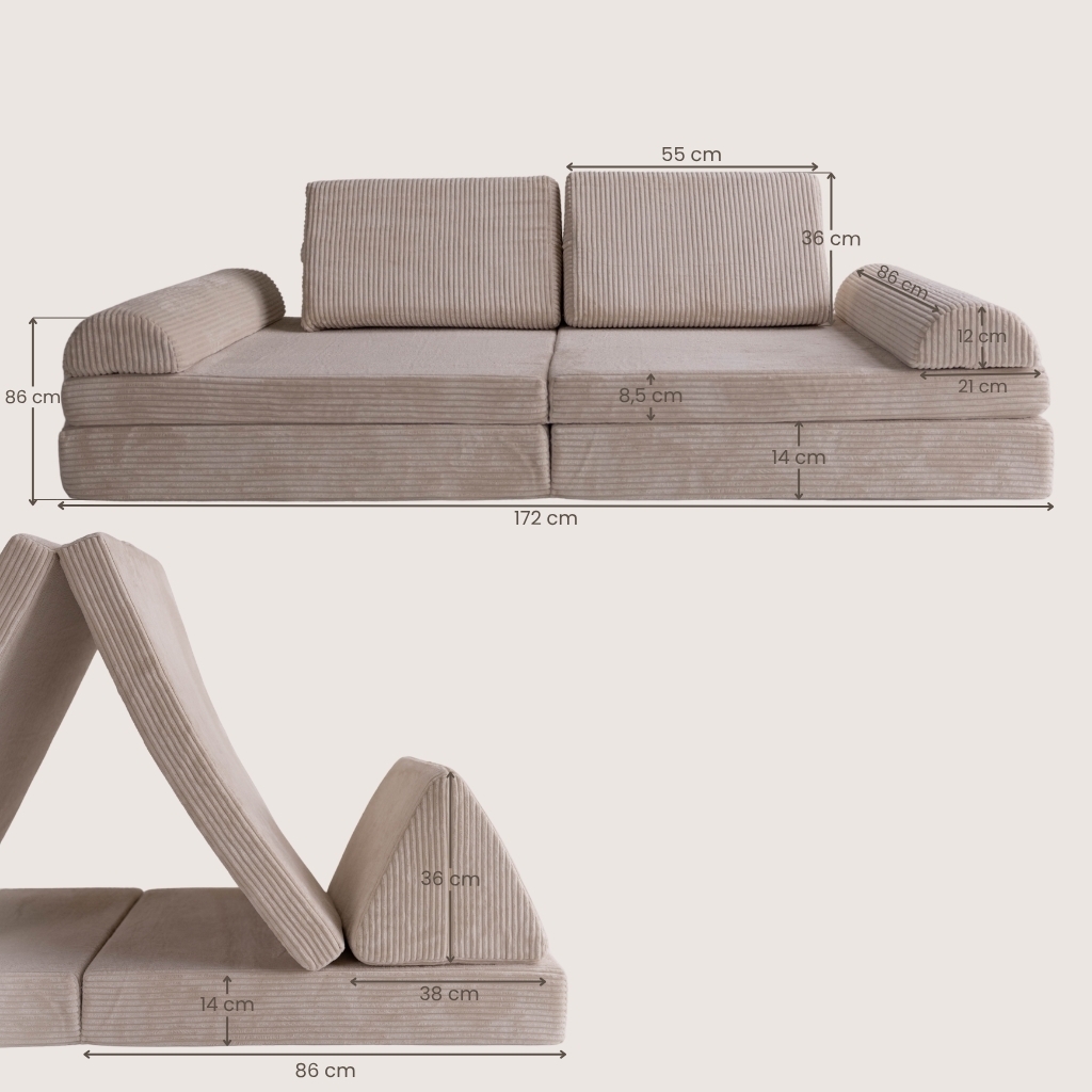 Voor de productie gebruiken we extra stevig meubelschuim. Dit heeft veel voordelen. Zo blijven de elementen goed in vorm. Bovendien is het voor volwassenen ook prima om er op te zitten. Net zo comfortabel als op een normaal bankstel. Door de stevige basis hebben kinderen ook nog meer mogelijkheden, doordat de delen minder snel omvallen als je ze rechtop zet.