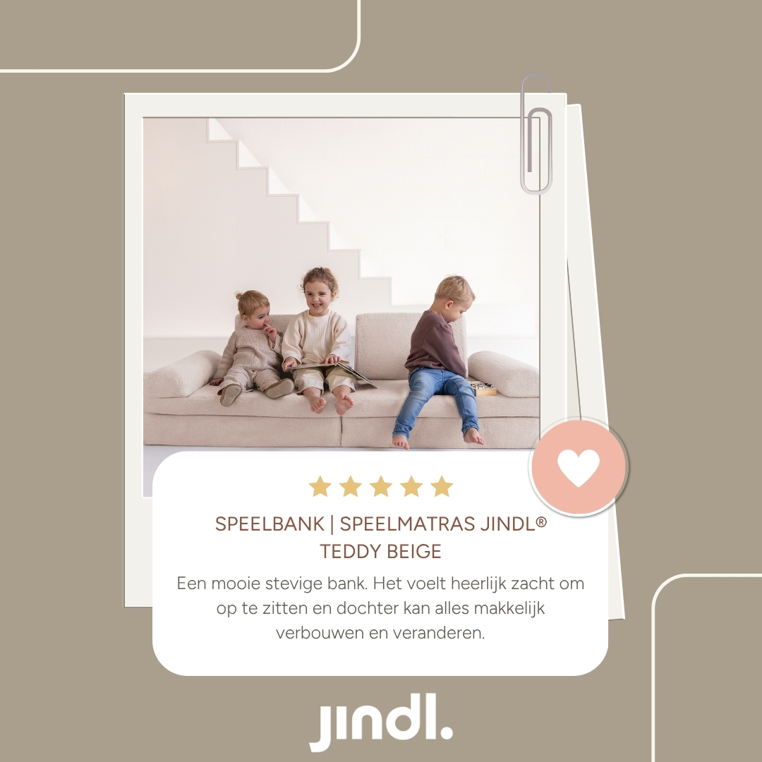 Met deze Jindl speelbank in het beige gemaakt van een zachte teddy stof heb je enorm veel mogelijkheden. Het is een echte SPEEL-bank. Kinderen verzinnen er namelijk de leukste dingen mee. Van een gewoon bankstel tot een hut en van een enorme poef tot een hindernisbaan of een winkeltje. Het kan echt allemaal. Doordat de bank uit verschillende delen bestaat die steeds anders neergezet kunnen worden, raken ze niet uitgespeeld.