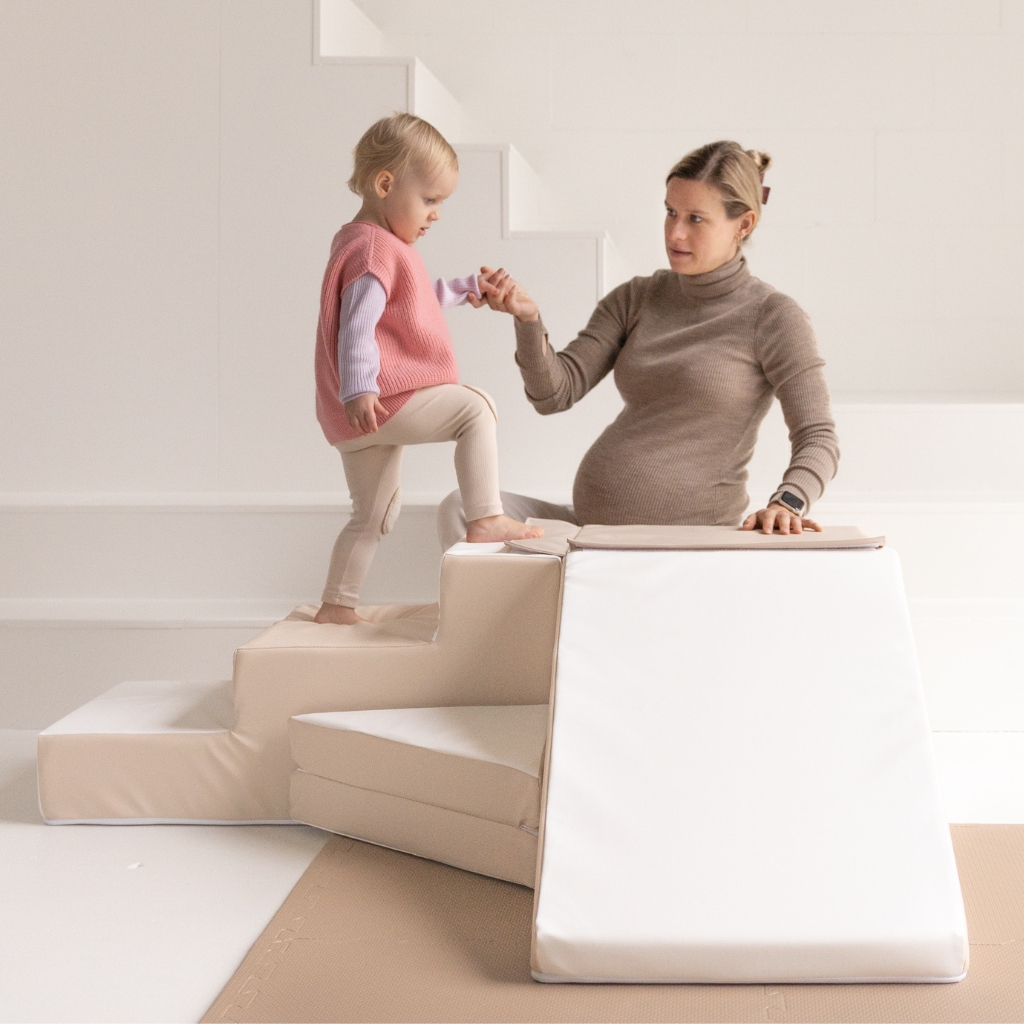 Leuke speelset gemaakt van foam in het wit met beige. Met deze leuke set kun je klimmen en glijden. Ook is dit een perfecte manier om je kind te leren zelf van de trap af en op te laten lopen. Alle 4 elementen zijn zacht, veilig en fantastisch om mee te spelen. Het schuim aan de binnenzijde is van hoge kwaliteit en elasticiteit om indeuken te voorkomen. Door de verhoogde dichtheid van het schuim wordt spelen nóg veiliger en verbetert het de efficiëntie van de oefeningen. Lekker spelen en ook nog eens goed voor de ontwikkeling.