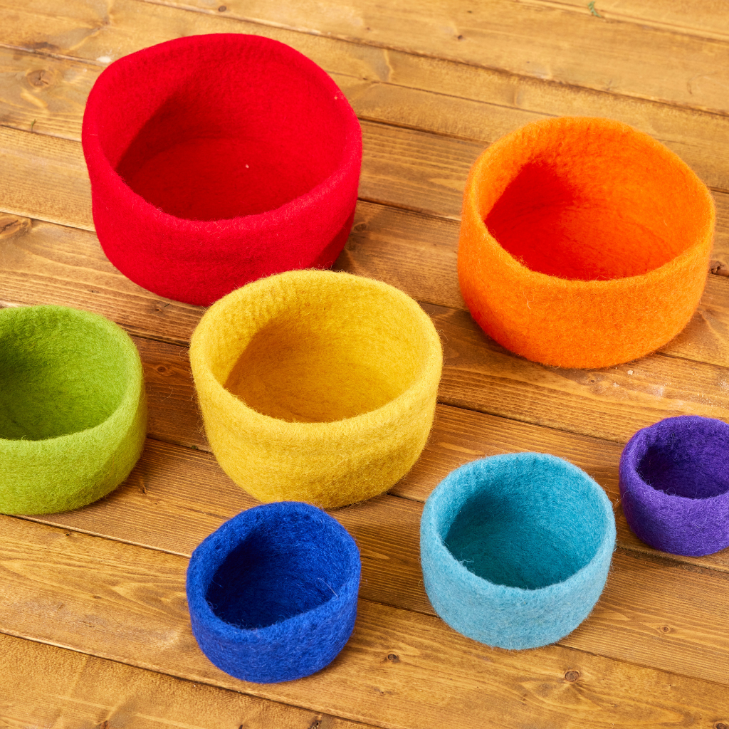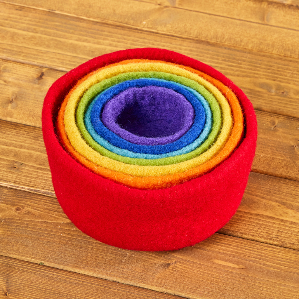 Vilten regenboog bakjes in vrolijke warme regenboogtinten. De bakjes kunnen in elkaar worden geplaatst en zijn ideaal voor het verzamelen van kleine materialen of het op kleur sorteren van sorteer speelgoed.