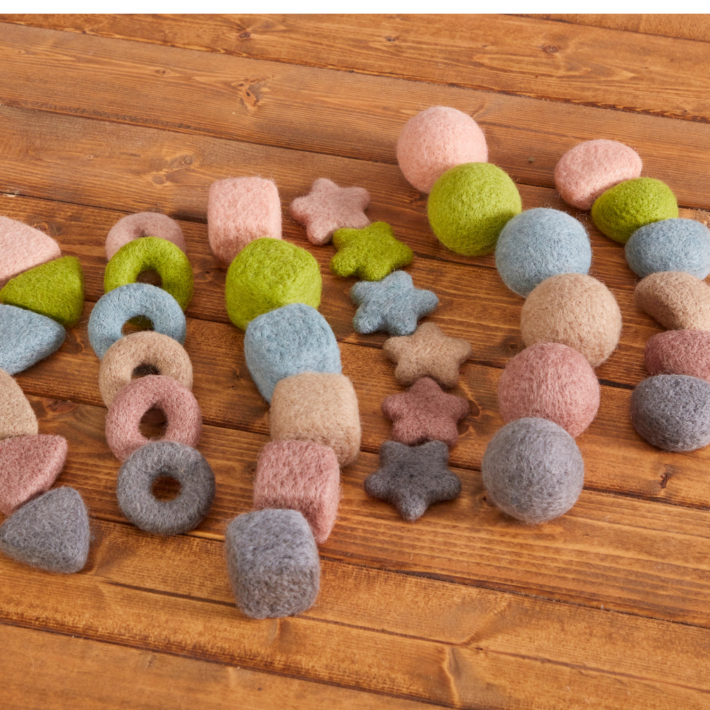 Deze vilten sorteerset bestaat uit een harmonieuze mix van zachte vormen en rustige kleuren. De set bevat onder andere bollen, ringen, kubussen en stervormen, waardoor kinderen eindeloos kunnen sorteren, stapelen en combineren.